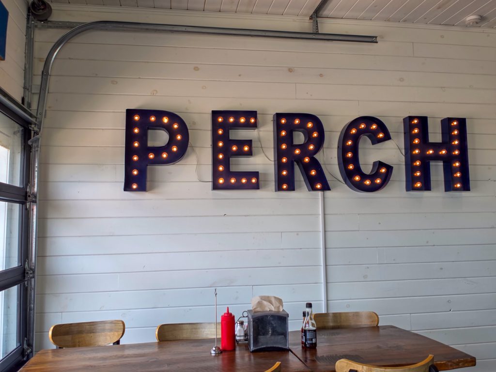 Perch sign inside Jolly Roger’s Seafood House